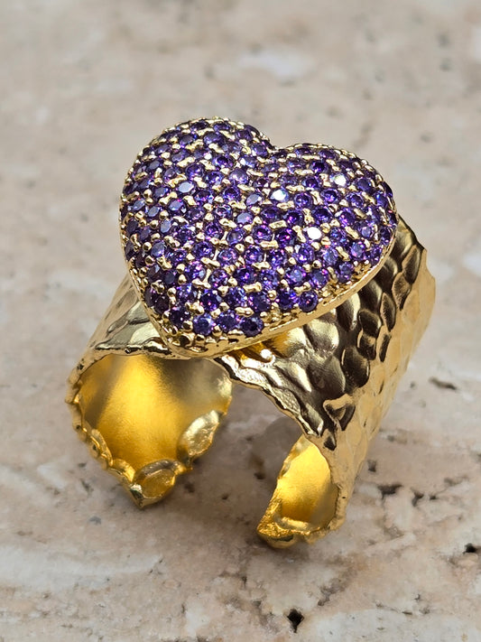 Sortija corrugada, color oro con corazón azul turquesa o violeta, ajustable